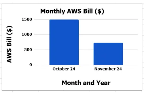 Bolosign came to CloudVictor in Oct 2024 and their AWS charge for Oct 2024 billing cycle was $1486. With our recommendations implemented by early Nov ’24, their Nov 2024’s AWS Bill amount was brought down to $720 which is approximately ~51.5% reduction.