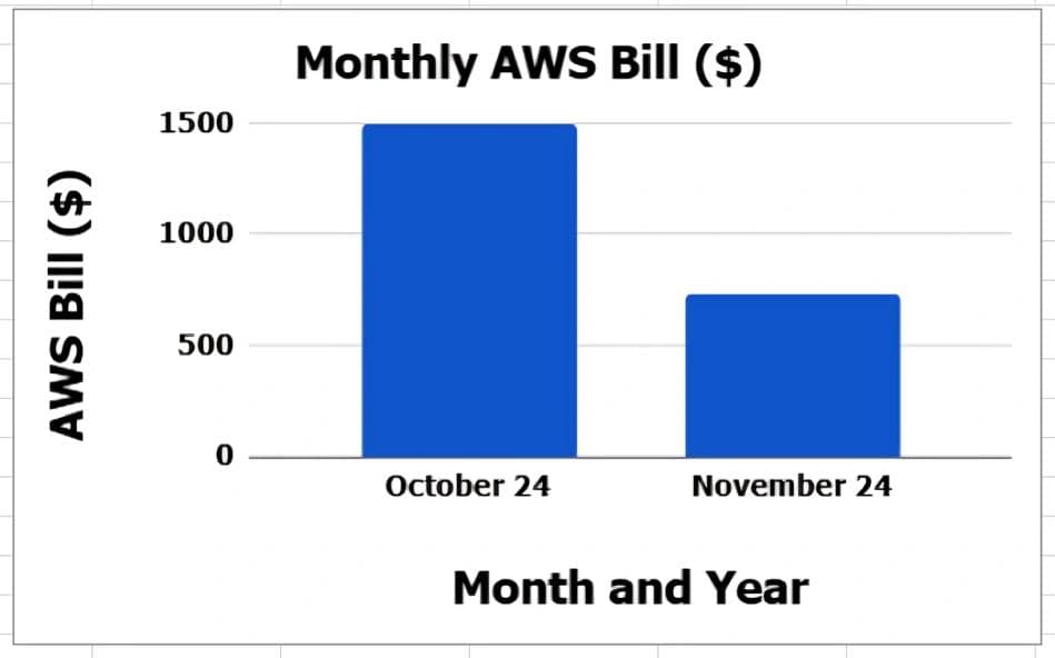 Bolosign came to Cygnius Consulting in Oct 2024 and their AWS charge for Oct 2024 billing cycle was $1486. With our recommendations implemented by early Nov ’24, their Nov 2024’s AWS Bill amount was brought down to $720 which is approximately ~51.5% reduction.